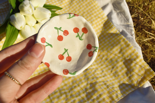 Strawberry Small Clay Cherry Tulip plate - Small ring dish , Cute Ceramic jewelry dish , painted rock