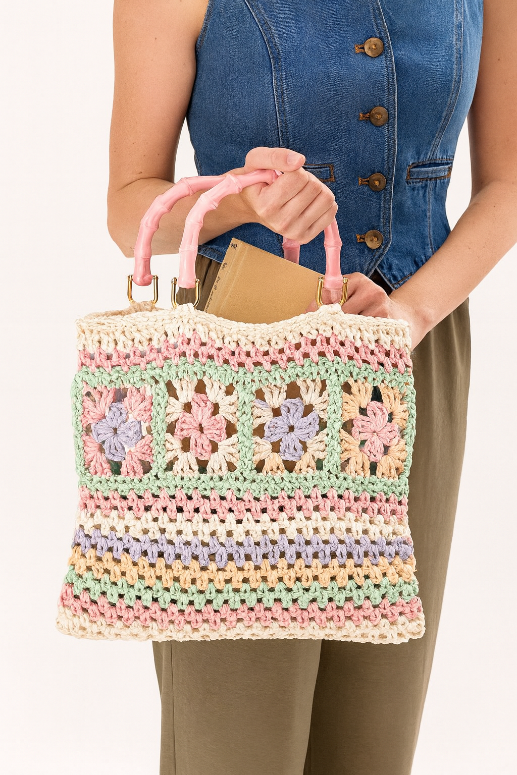 Sunday Tote Crochet Pattern PDF, Granny Square Bamboo Handle Bag