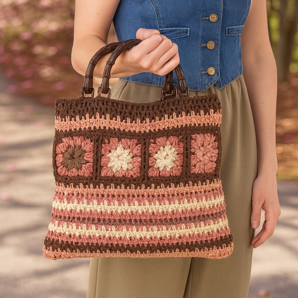 Make your own stylish and eco-friendly Granny Square Tote Bag with this easy-to-follow crochet pattern. Featuring a striped market tote design and optional bamboo handles, this handmade summer purse is the perfect blend of fashion and functionality.